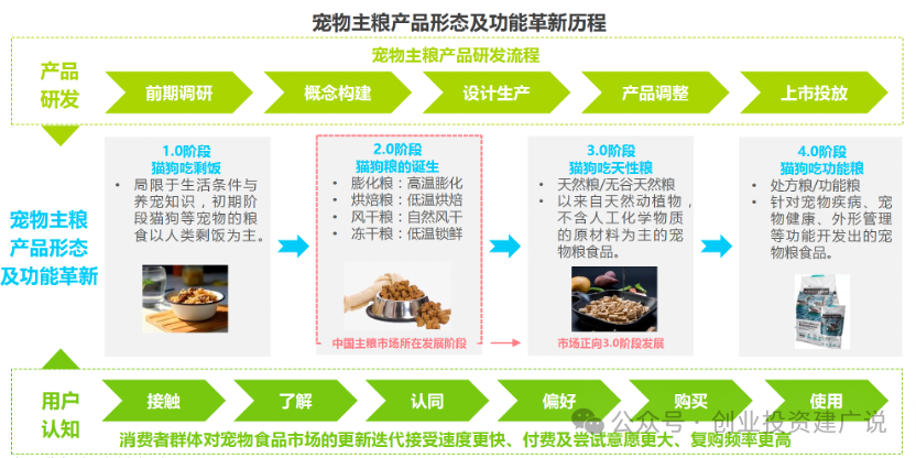随着宠物行业市场规模的持续扩大及消费者科学养宠意识的不断提升,宠物主粮行业在发展中迎来了品牌与品类的升级。主粮产品的革新主要集中于形态及功能两大方面,从过去猫狗吃剩饭,到宠物粮食的诞生及品类细化,进一步创新出天性粮和功能粮等新产品。目前我国宠物主粮市场发展处在2.0阶段中,宠物主逐渐接受为宠物购买商品主粮,更多的宠物主开始重视宠物的营养健康。