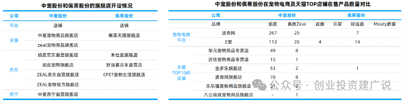 渠道对比:线上直营渠道方面,中宠股份和佩蒂股份均在天猫、京东等主要电商平台开立旗舰店,其中中宠股份旗舰店的关注人数高于佩蒂股份;