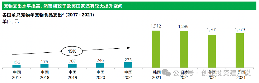 2021年35%的宠物主月收入超过10,000元,2019年该比例仅有25%。宠物主中高收入人群占比的增加,以及与宠物的强烈情感纽带将推动宠物相关产品的支出水平提高,2021年国内单只宠物年食品支出为273元,虽近五年增速近15%,但和国际领先国家仍有较大差距,未来仍有提升空间。