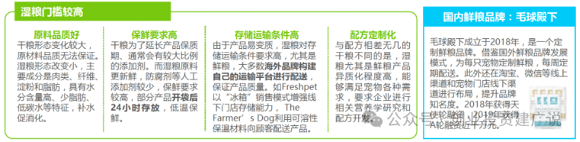 赛道高门槛:湿粮产品对原料形态改变小,保鲜要求高,生产工艺运输条件要求高,配方定制化,赛道门槛较高。