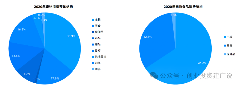 2020年,在宠物行业整体消费中,包括宠物主粮、零食和保健品在内的宠物食品占比达到54.7%,在宠物食品细分市场中,宠物主粮、宠物零食消费和宠物保健品消费分别占到整体的65.6%、32.5%和1.8%。尽管主粮消费仍占据宠物食品消费的主体地位,近年来其占比却在不断的降低。宠物主为了给宠物获得更均衡的营养,开始关注并尝试宠物零食与宠物保健品,宠物食品开始走向精细化与细分化。