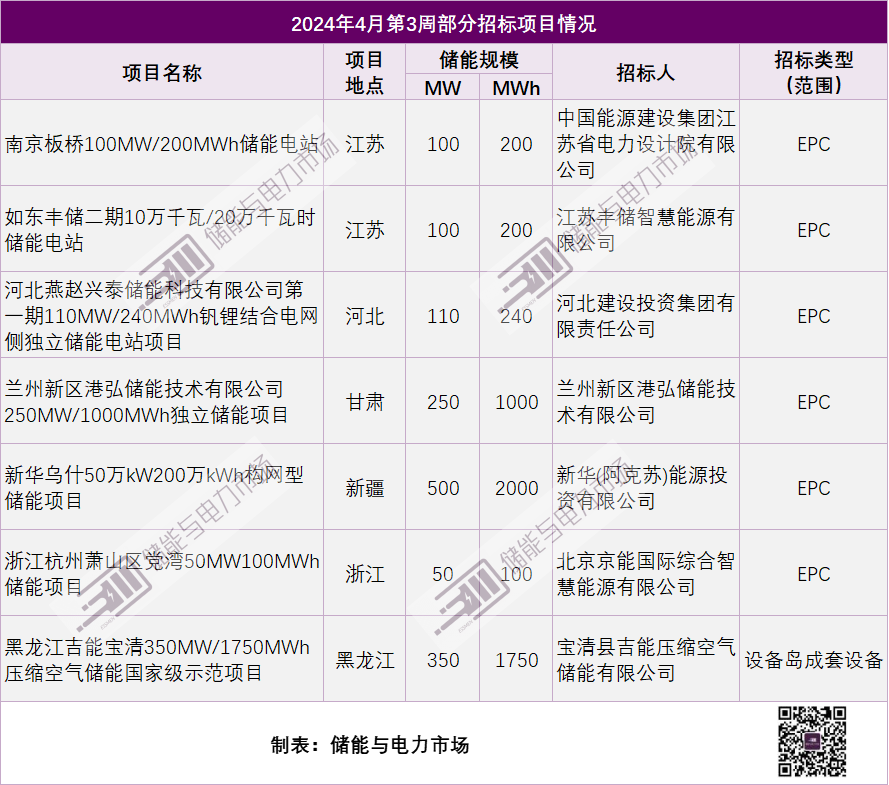 储能与电力市场跟踪显示,2024年4月第2周,进入在建/并网投运的储能项目326MWh。储能招标规模6.15Wh。其中包括多个GWh以上电化学储能与压缩空气储能项目。