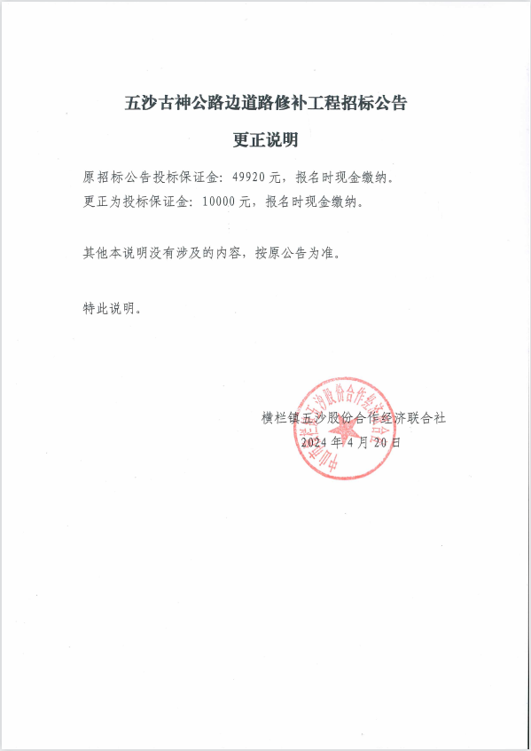 五沙古神公路边道路修补工程招标公告更正说明