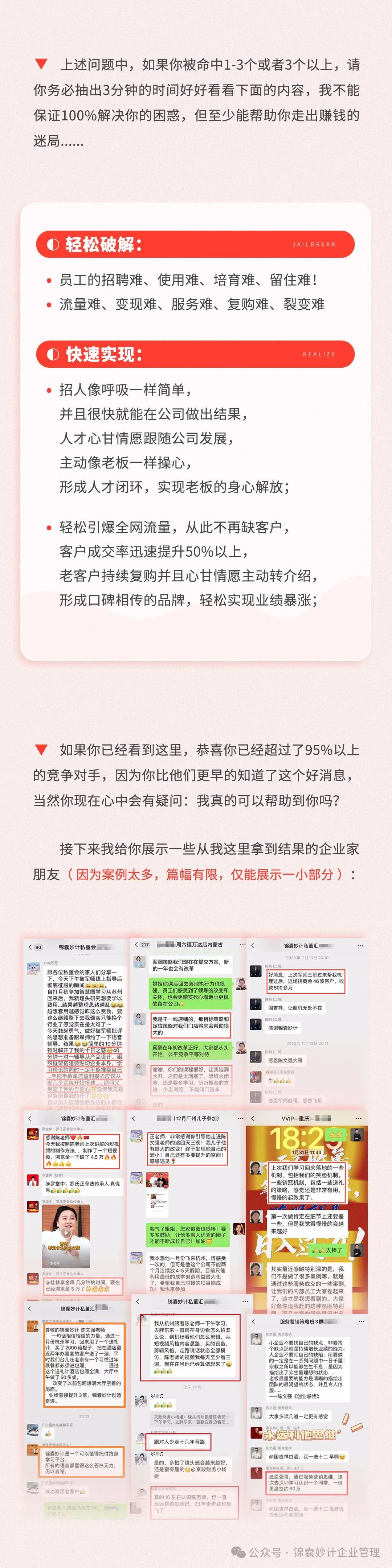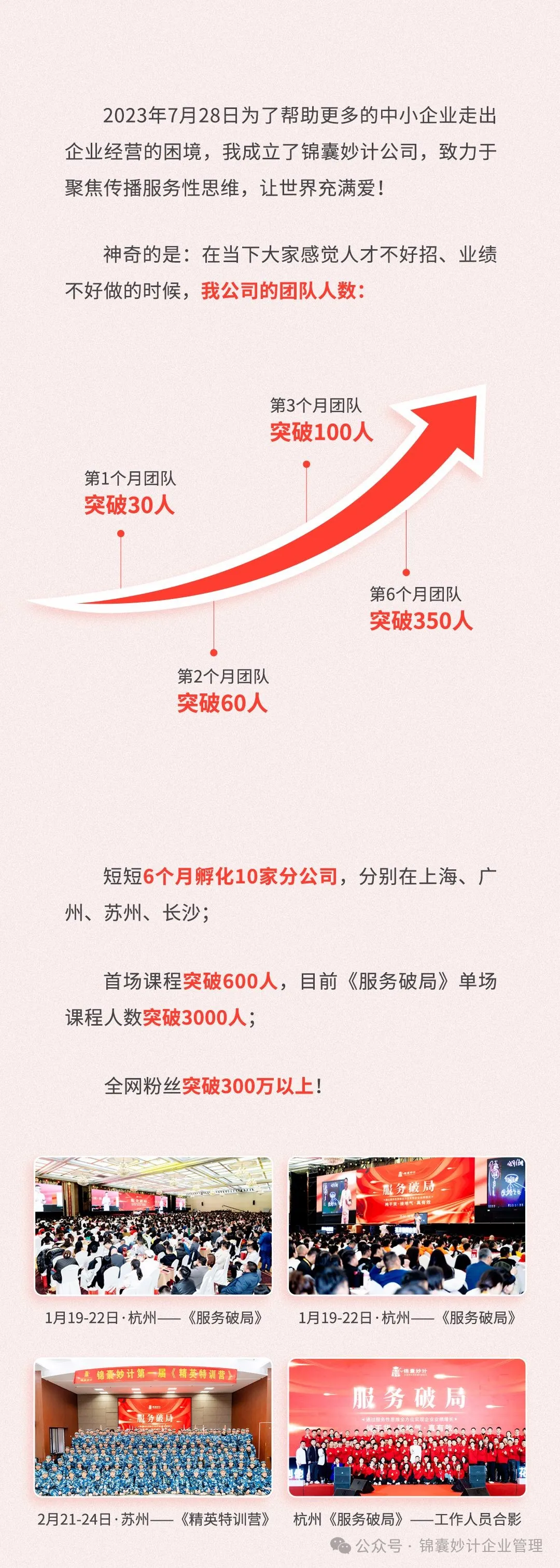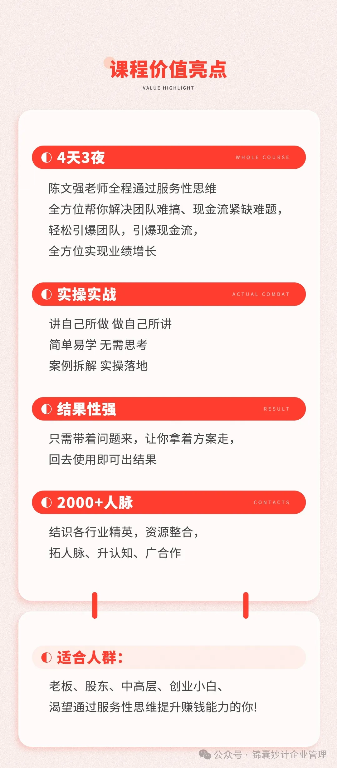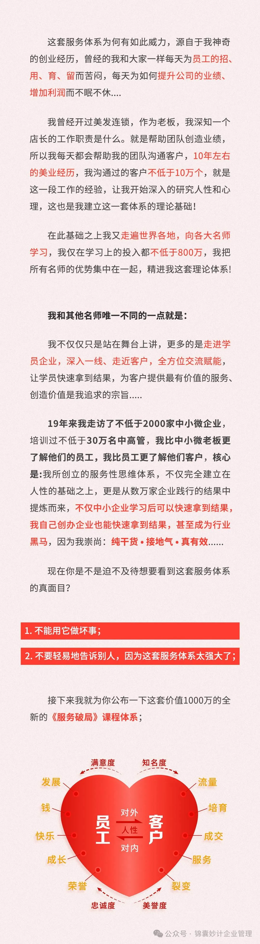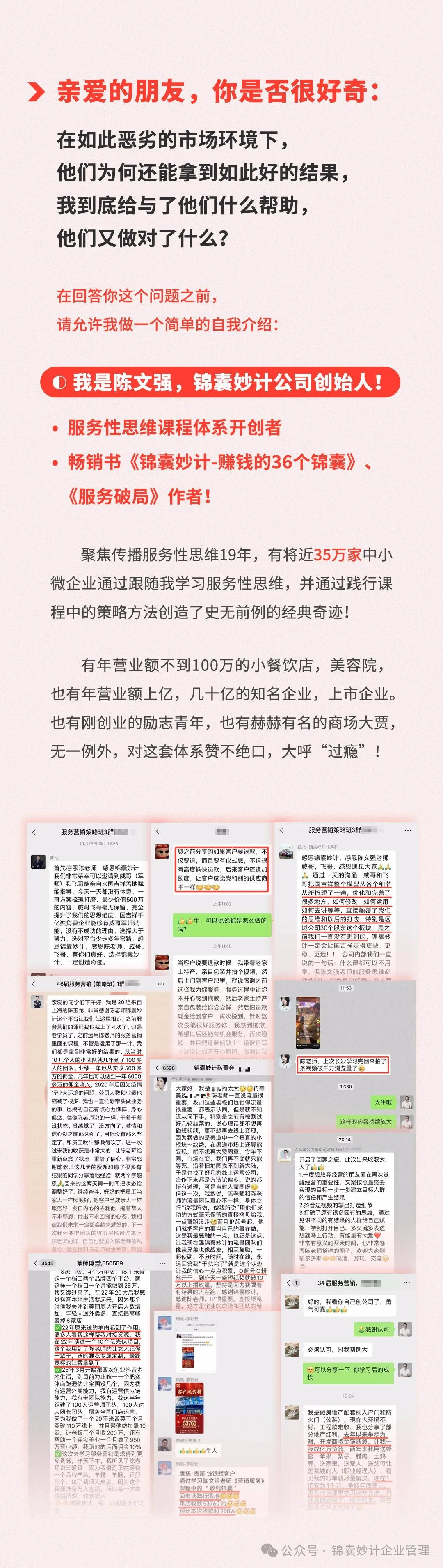 通过偶然的机会,我们接触了锦囊妙计和陈文强老师一起学习服务营销,对外服务好客户对内服务好员工。