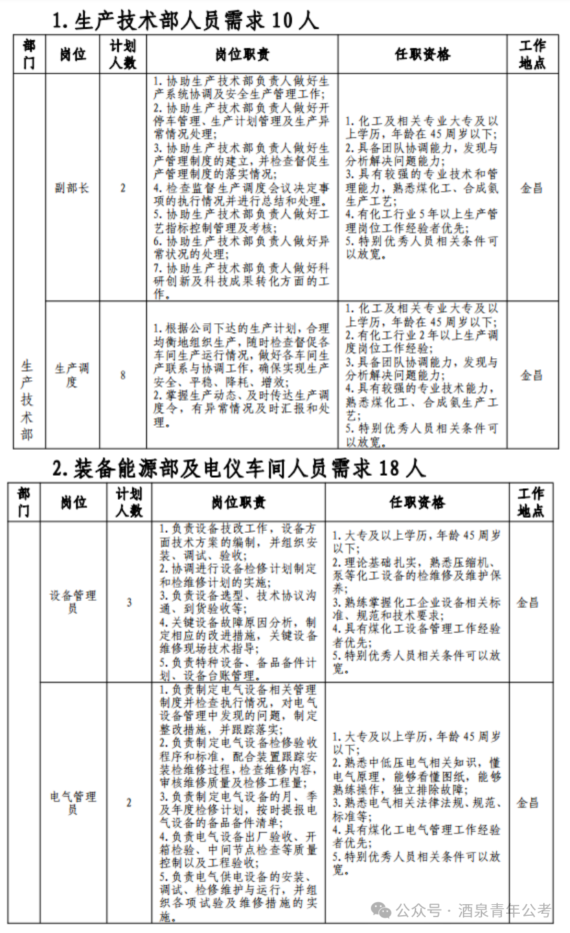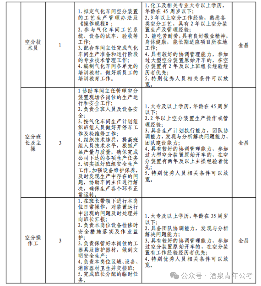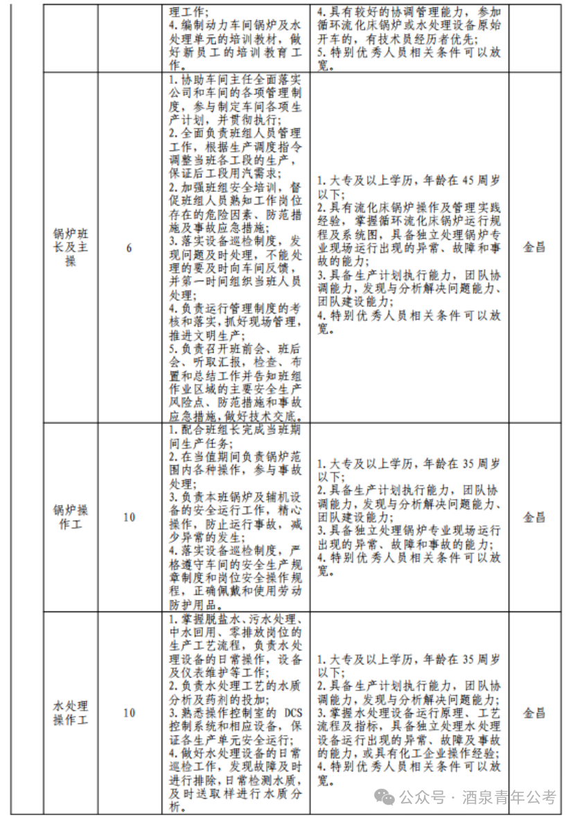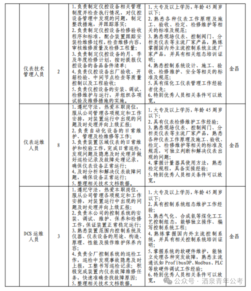 (七)具有突出可查业绩或获得县处级及以上奖励或具有相关专业中级以上职称者可适当放宽年龄限制;应聘人员有化工企业工作经历的优先。