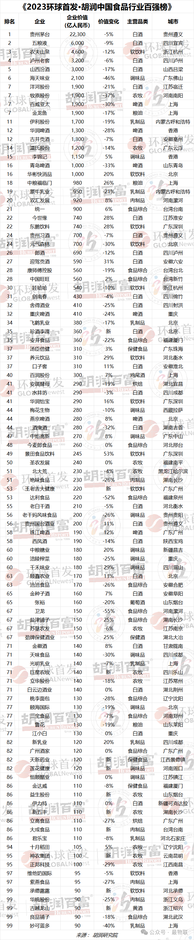 2024年1月29日,胡润研究院携手环球首发,今日于上海西虹桥联合发布《2023环球首发·胡润中国食品行业百强榜》(2023 Global Newest · Hurun China Food Industry Top 100),按照企业市值或估值进行排名。上市公司市值按照2023年10月9日的收盘价计算,非上市公司估值参考同行业上市公司或者根据最新一轮融资情况进行估算。这是胡润研究院第三次发布“中国食品行业百强榜”。