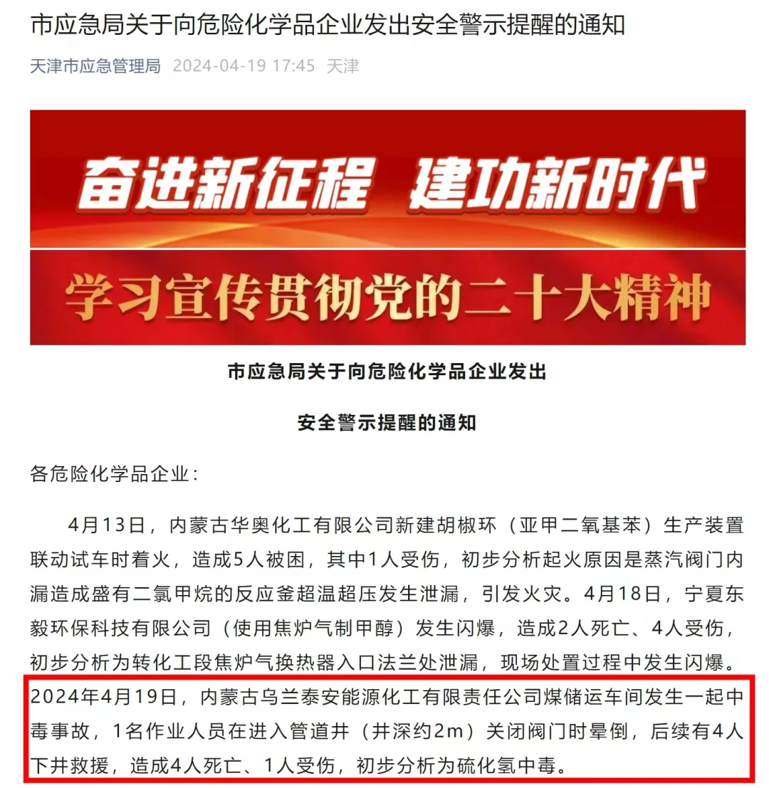 该起事故,由天津市应急管理局向危险化学品企业发出的一则安全警示通知中提到。