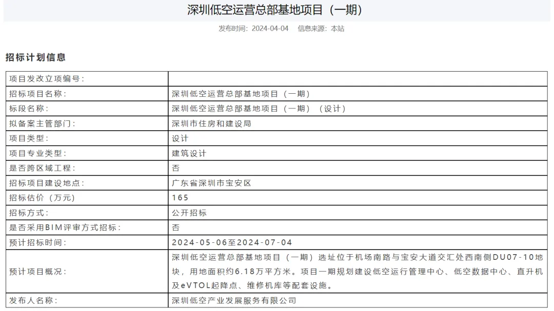 4月初,深圳低空运营总部基地项目浮出水面,显示将于5月-7月进行设计招标。该项目选址位于机场南路与宝安大道交汇处西南侧地块,用地面积约6.18万平方米。项目一期规划建设低空运行管理中心、低空数据中心、直升机及eVTOL起降点、维修机库等配套设施。