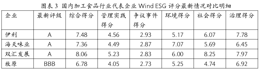 从ESG综合得分看,国内代表食品加工企业的平均得分为7.42高于全A股平均得分6.33,处于A股上游水平。从细分得分情况看,代表企业除了在治理维度平均得分7.28略低于A股总平均得分7.32外,其余管理实践(4.58/3.53)、争议事件(2.84/2.76)、环境议题(5.87/3.64)以及社会议题(6.19/3.22)平均得分均高于A股总平均得分。由此可见,所选取国内加工食品行业代表ESG综合得分很好。其中,双汇发展的ESG综合得分高达8.06,评级为A,是所选国内加工食品行业代表中ESG评分最好的企业。