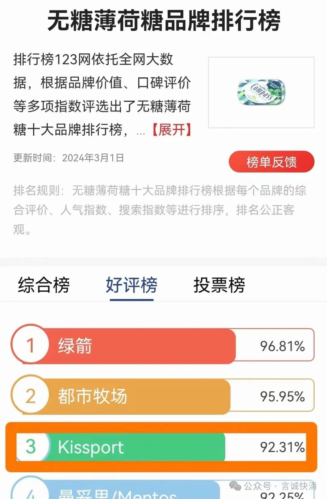 1、中国无糖薄荷糖十大品牌好评榜第三位。