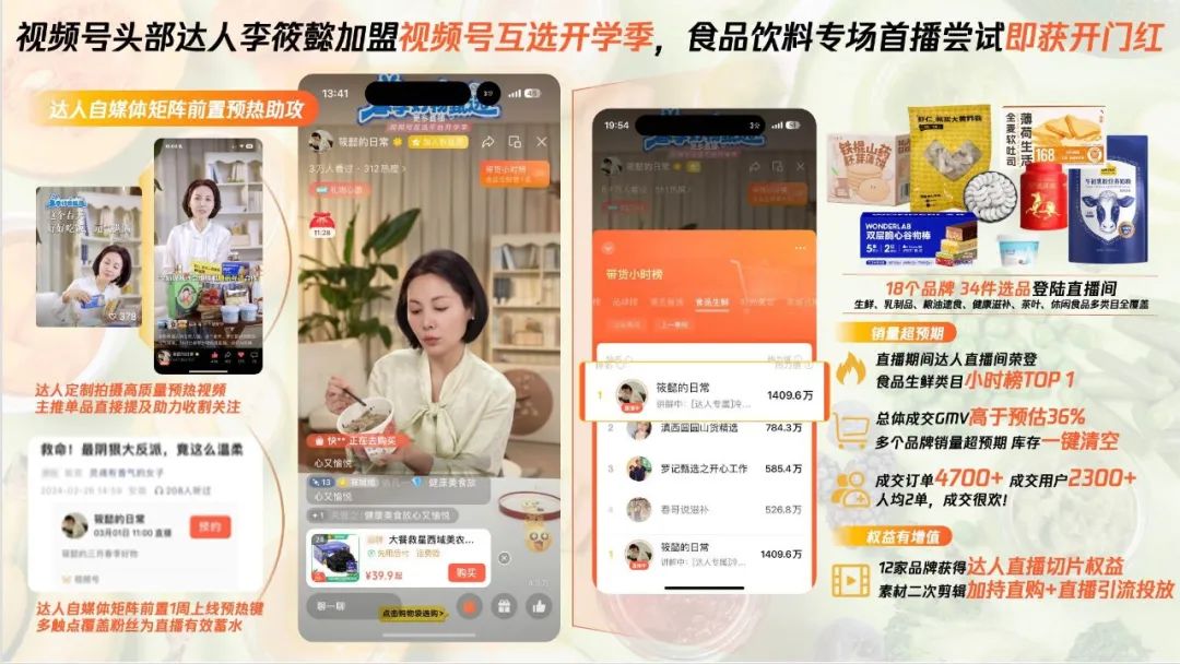 ·视频号达人直播带货,以直链转化为品牌带来销量增长。如视频号互选开学季头部达人李筱懿的食品专场首播,便以完整筹备,收获突出转化效果。