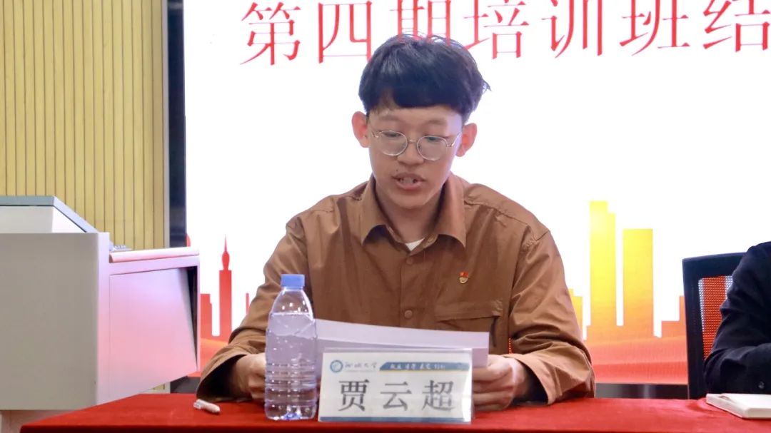 第四期培训班的结业学员代表2020级1班王向前向大家分享了自己在培训过程中的收获与感悟,他表示,青马工程教会了自己担当,提升了自己的思想,开拓了自己的视野,提升了自己的民族自豪感,青马工程让自己明白了作为一个青年学子和学生干部肩上的浓浓重担。作为新时代的大学生,我们应不忘初心、牢记使命、奋勇担当、砥砺前行,紧紧团结凝聚在以习近平总书记为核心的党中央周围,为建设富强民主文明和谐美丽的社会主义现代化强国、实现中华民族伟大复兴的中国梦汇聚起磅礴的青春力量。