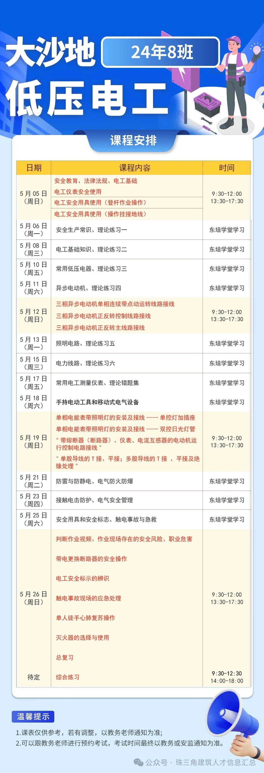 培训专业:防水工、油漆工、抹灰工、钢筋工、架子工、测重工、混凝土工、模板工、木工、砌筑工、镶贴工、石作业工、水电工、瓦工、机械设备安装工、管道工、通风工、低压电工、维修电工、安装电工