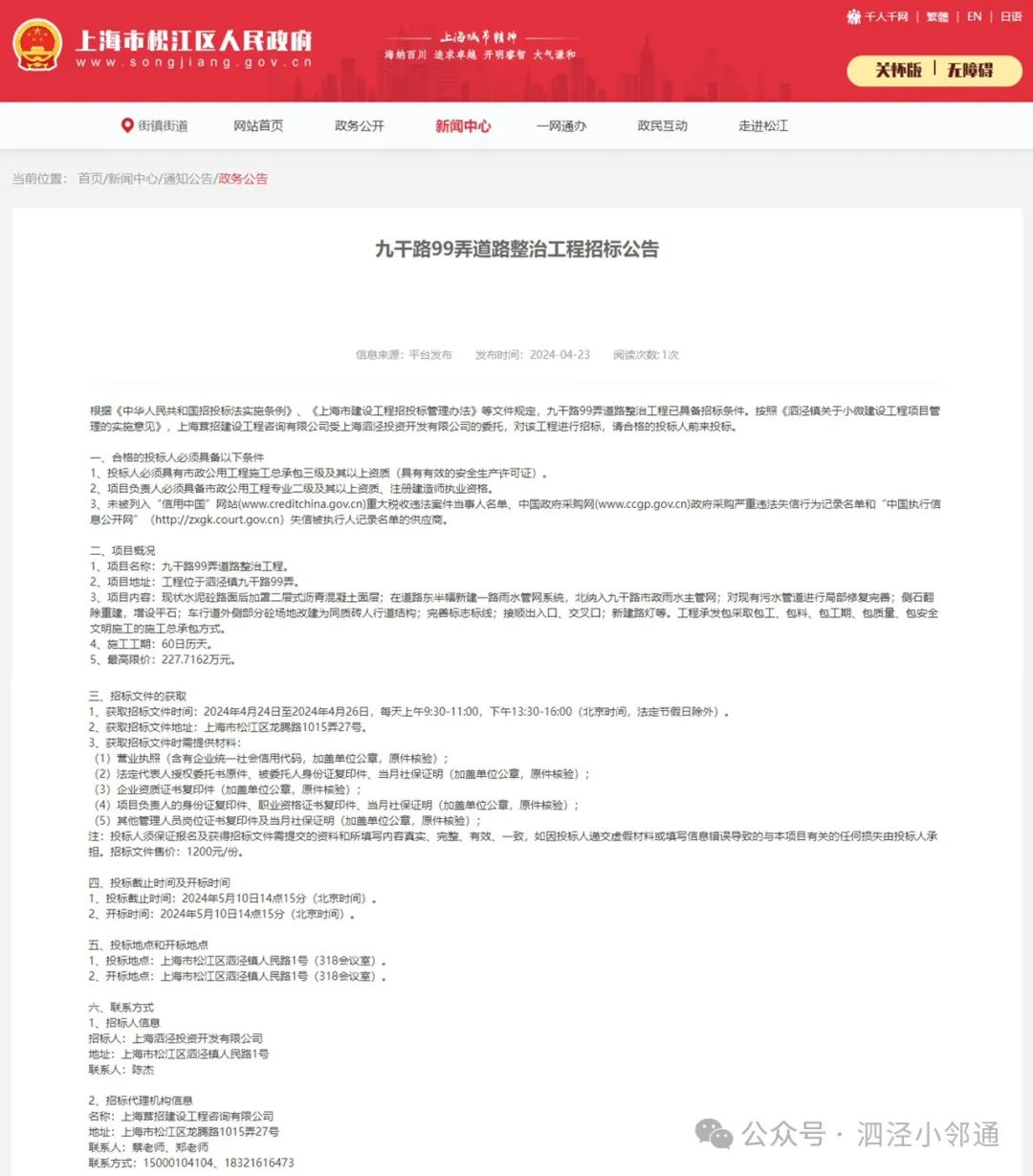 九干路99弄道路整治工程招标公告