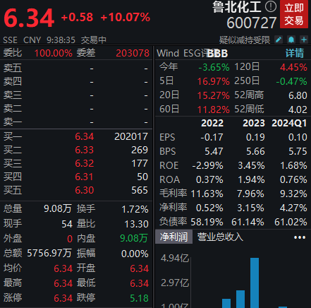 4月25日,钛白粉板块涨幅居前,截至发稿,鲁北化工一字涨停,报6.34元,成交额5756.97万元。