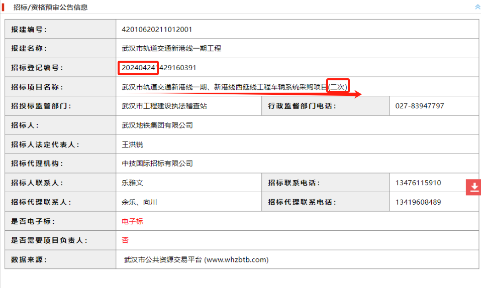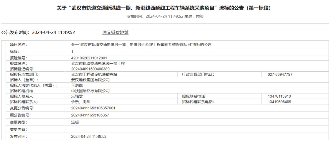 4月24日,武汉市公共资源交易中心发布关于“武汉市轨道交通新港线一期、新港线西延线工程车辆系统采购项目”流标的公告。