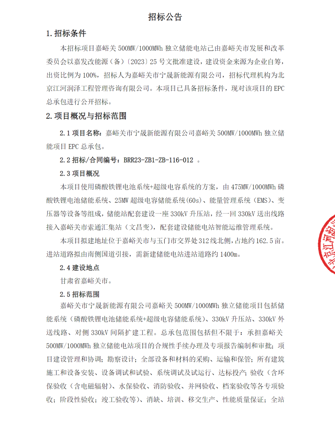 嘉峪关市宁晟新能源有限公司嘉峪关500MW/1000MWh独立储能项目EPC总承包招标公告