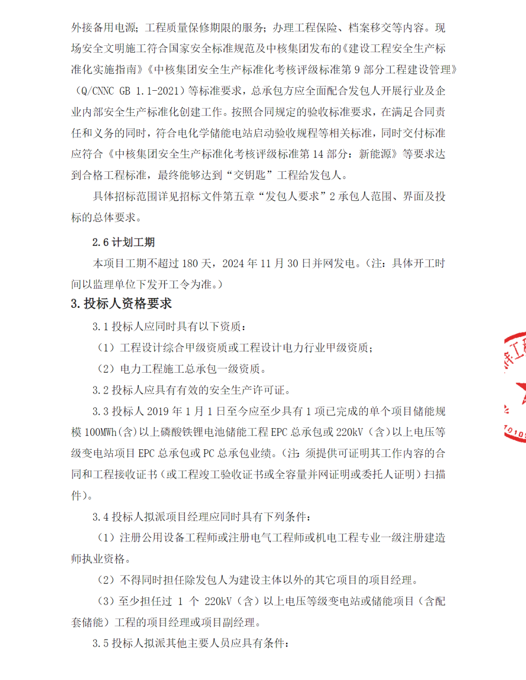 招标范围:包括储能系统(磷酸铁锂电池储能系统+超级电容储能系统)、330kV升压站、330kV外送线路、对侧 330kV间隔扩建工程。总承包范围包括但不限于:合规性手续办理及专项报告编制和审批;项目建设管理和协调;勘察设计;全部设备和材料的采购、运输和保管;所有建筑施工和设备安装、设备调试和试验、系统调试及试运行、达标投产;验收、消缺、培训、移交生产、性能质量保证;全站外接备用电源;工程质量保修期限的服务;办理工程保险、档案移交等内容。