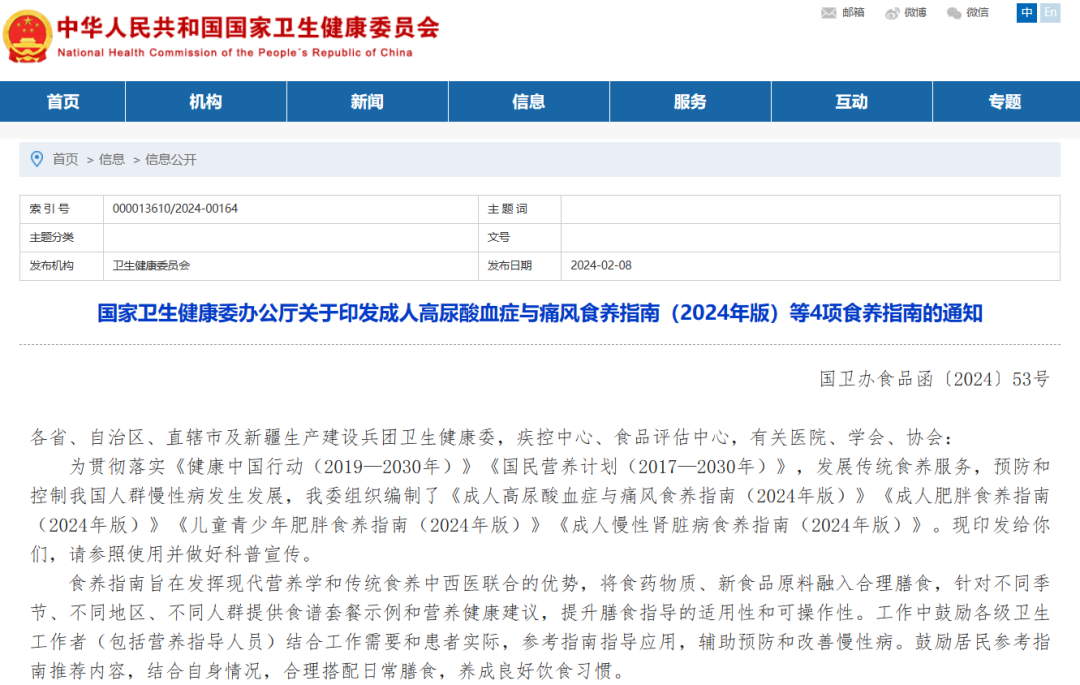 2月8日,国家卫生健康委员会发布了四项2024年版食养指南,其中包括《成人高尿酸血症与痛风食养指南(2024年版)》、《成人肥胖食养指南(2024年版)》、《儿童青少年肥胖食养指南(2024年版)》和《成人慢性肾脏病食养指南(2024年版)》。