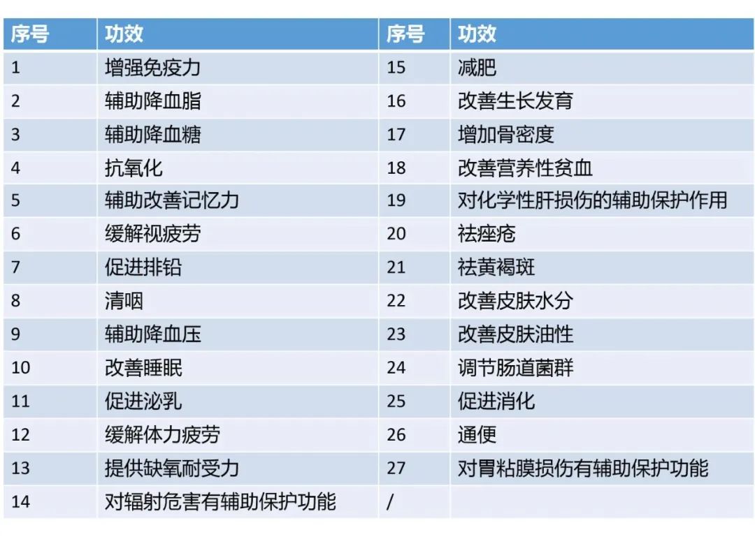 根据GB 16740-2014《食品安全国家标准保健食品》中的定义,保健食品是指声称并具有特定保健功能或者以补充维生素、矿物质为目的的食品。即适用于特定人群食用,具有调节机体功能,不以治疗疾病为目的,并且对人体不产生任何急性、亚急性或者慢性危害的食品,该定义与功能食品定义相同。具体功效如下: