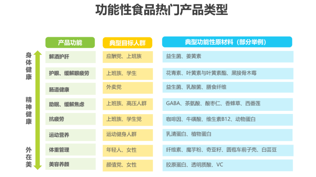 功能性食品作为普通食品无法声称功效,因此产品多选择市场教育较为成熟的功能成分,降低消费者教育成本。产品功能上,集中在肠道健康、美容养颜、护眼、助眠、体重管理等年轻人比较关注的方向。