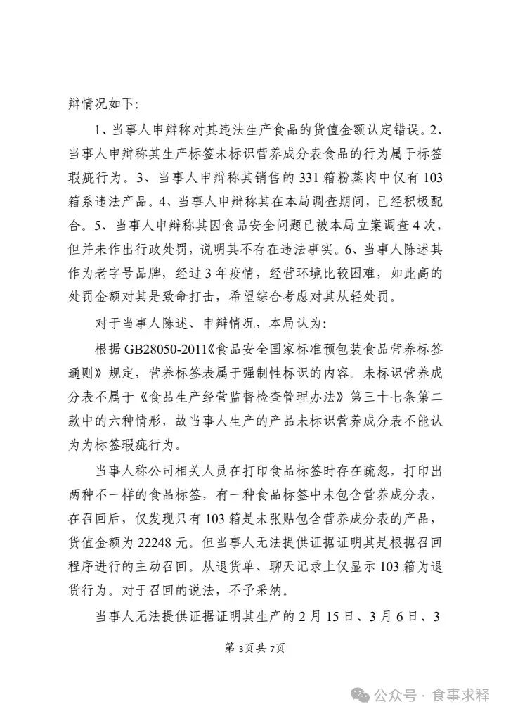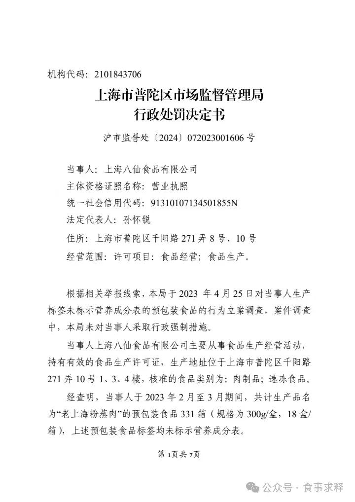 上海市普陀区市场监督管理局发布的行政处罚决定(沪市监普处〔2024〕072023001606号)显示,2023年2月至3月期间,上海八仙食品有限公司生产了名为“老上海粉蒸肉”的预包装食品331箱(规格为300g/盒,18盒/箱),上述预包装食品标签均未标注营养成分表。