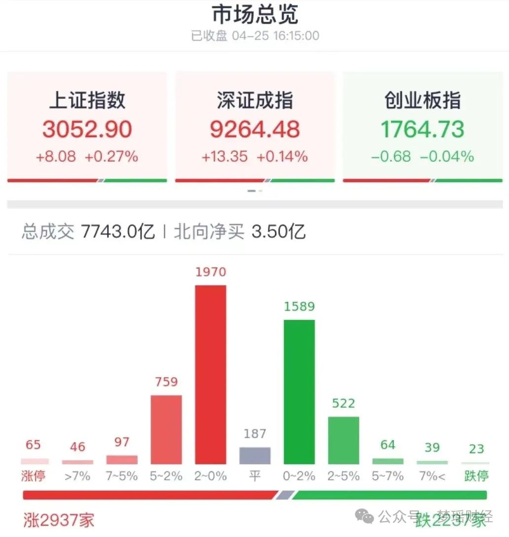 4月25日,A股震荡反弹,盘面上,业绩线进一步发酵,以钛白粉为首的化工股全线爆发,惠云钛业、南京聚隆、仁信新材等多股直线20%涨停,减肥药等医药股反弹,银行股尾盘冲高;下跌方面,军工信息化、AI赛道、跨境支付等板块回调。值得注意的是,继周三两市全天成交7954亿后,周四继续缩量,全天仅成交7743亿。最近连续多日维持在8000亿以下的水平,节前效应非常明显。