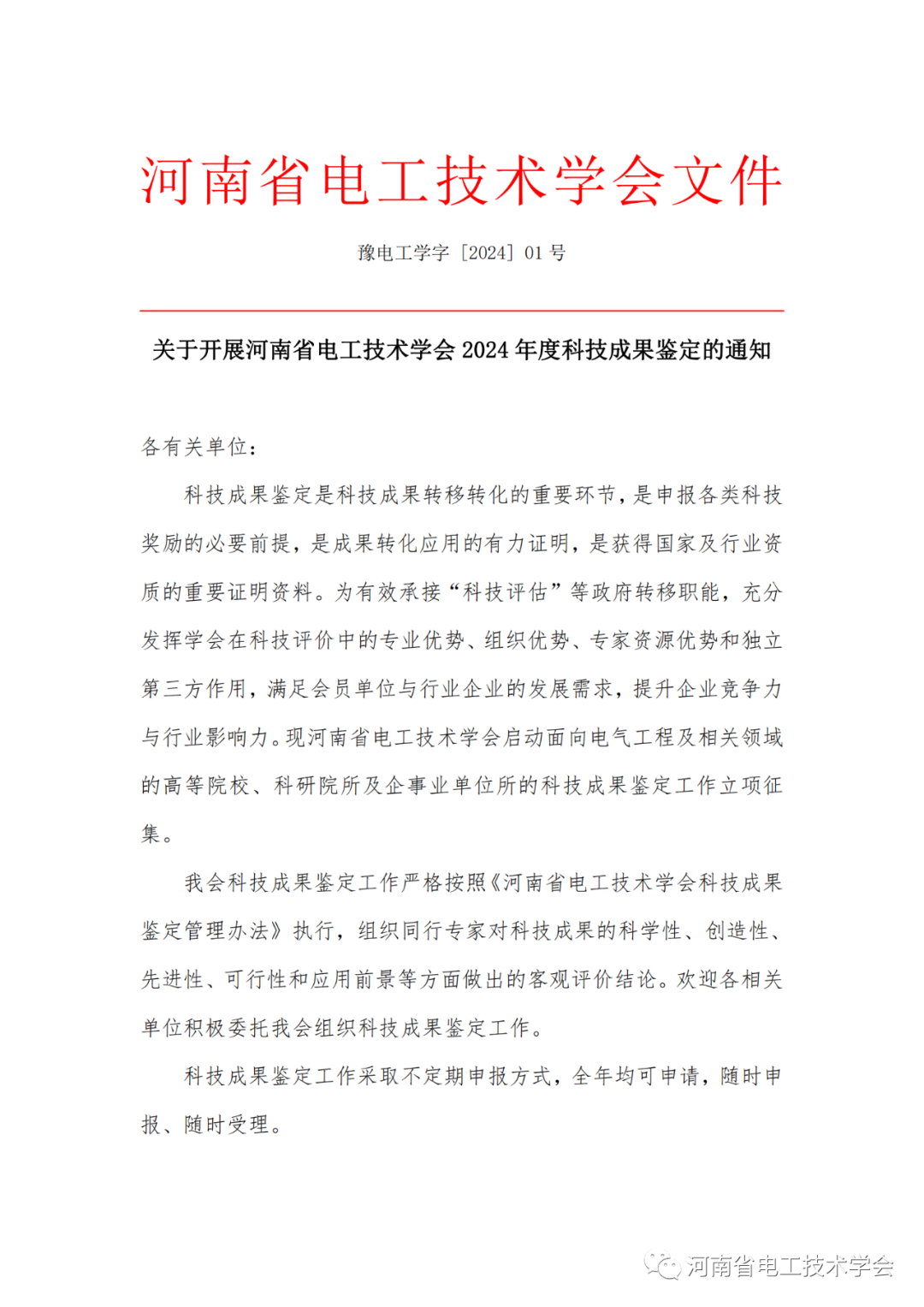 关于开展河南省电工技术学会2024年度科技成果鉴定的通知