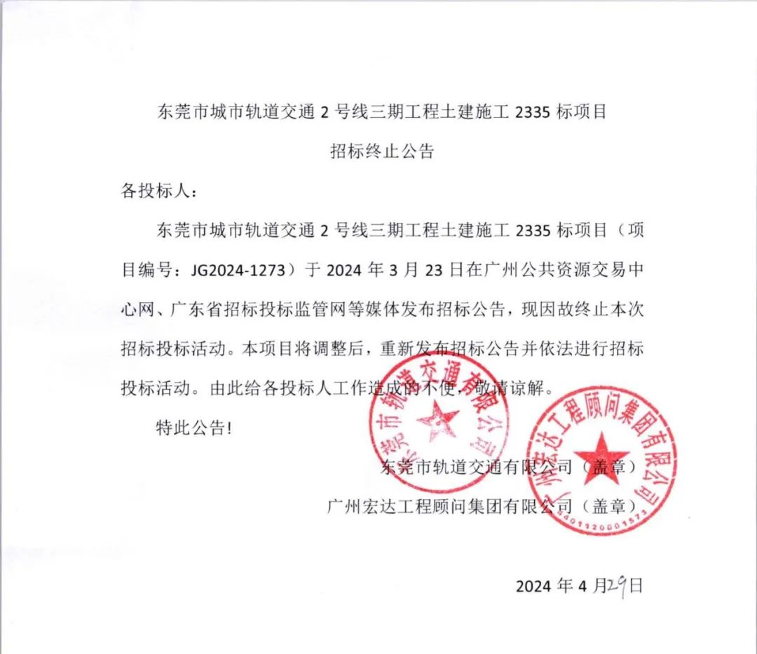 东莞市城市轨道交通2号线三期工程土建施工2335标项目(项目编号:JG2024-1273)于2024年3月23日在广州公共资源交易中心网、广东省招标投标监管网等媒体发布招标公告,现因故终止本次招标投标活动。本项目将调整后,重新发布招标公告并依法进行招标投标活动。由此给各投标人工作造成的不便,敬请谅解。