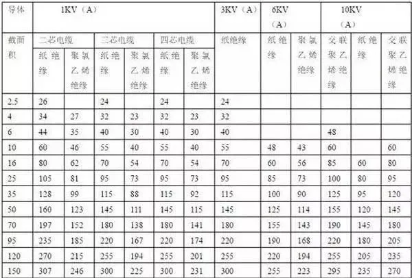 1、铜芯电缆的载流量为表中数值乘以系数1.3倍;