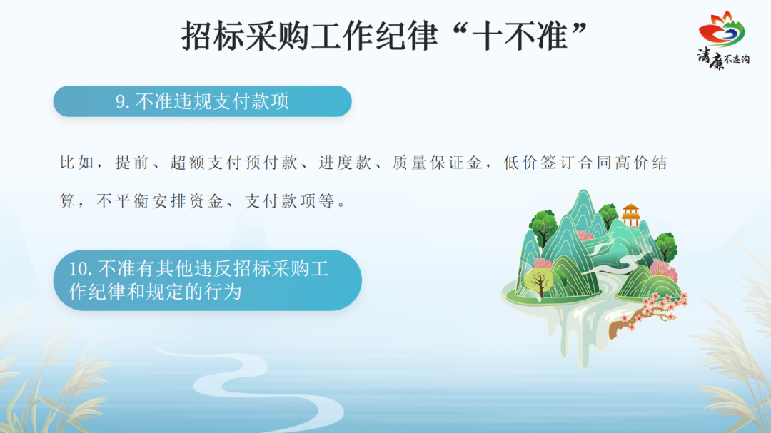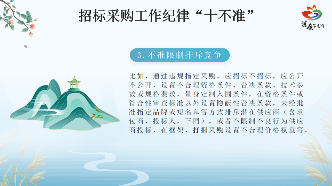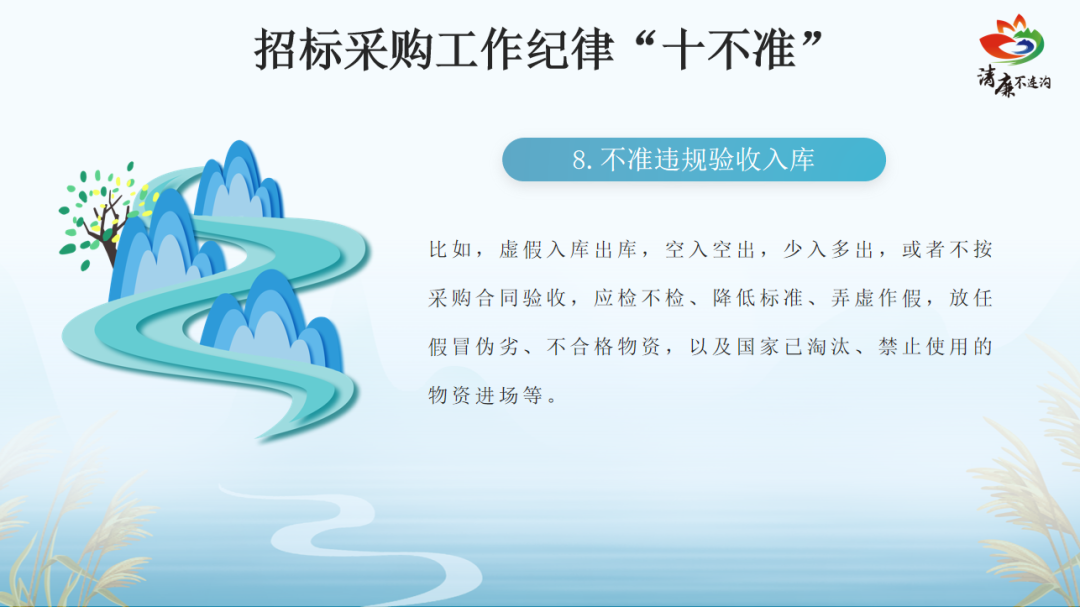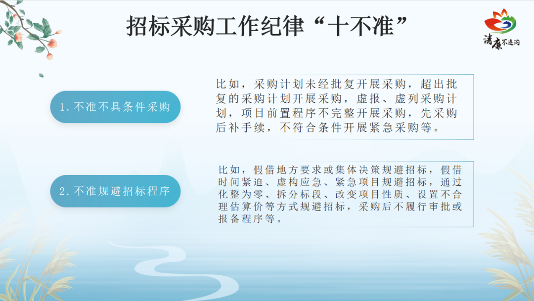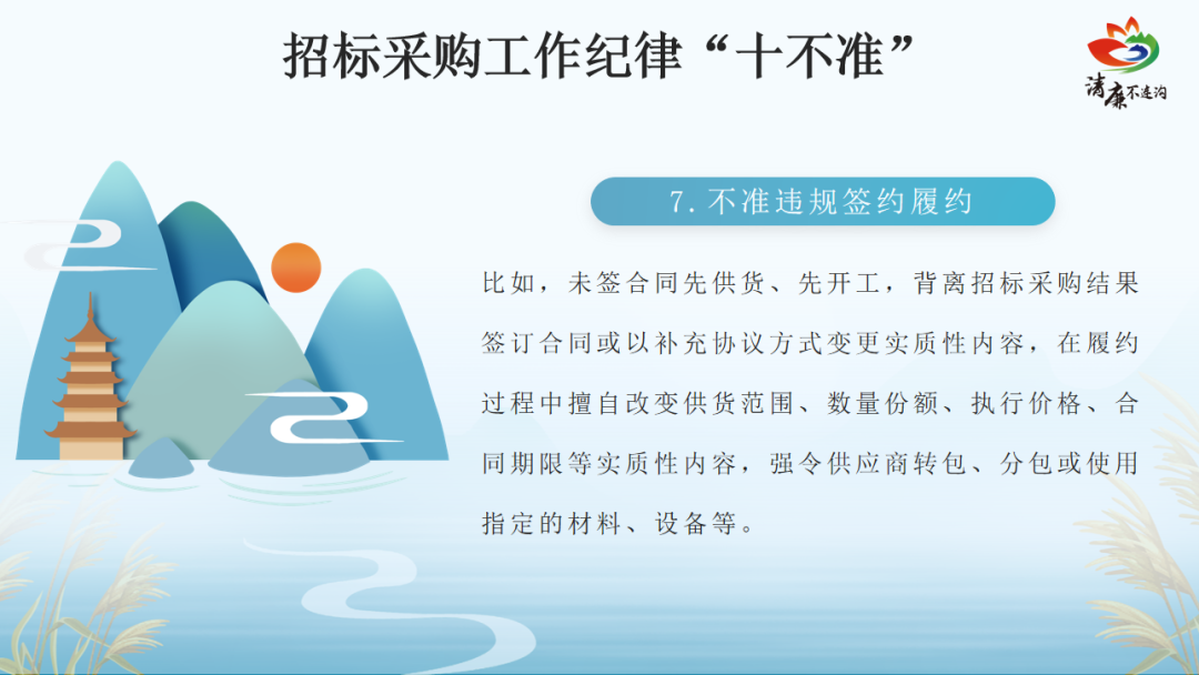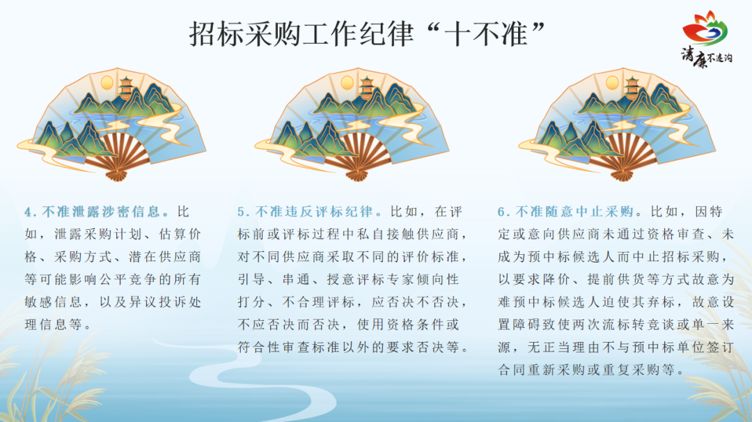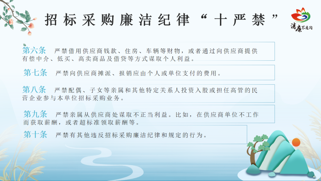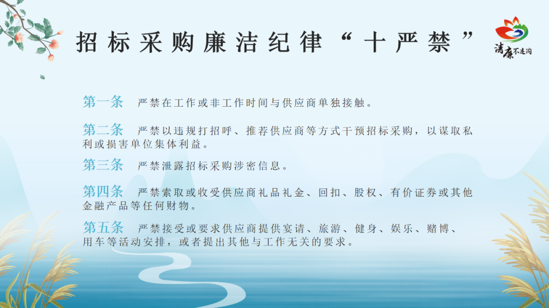 近日,华电煤业集团有限公司印发了《招标采购廉洁风险防控“双十条”》,即:招标采购工作纪律“十不准”、廉洁纪律“十严禁”,进一步严肃招标采购工作纪律和廉洁纪律,推动系统广大党员干部和关键岗位人员学纪、知纪、明纪、守纪,为公司健康高质量发展营造良好环境。
