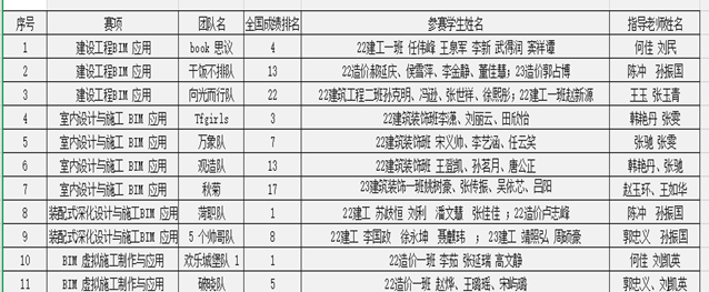 2024年“鲁班杯”数字孪生创新应用大赛初赛落下帷幕,我院师生再创佳绩!菏泽职业学院建筑与化工学院今年共组织了21支队伍参加了本次大赛高职组的建设工程BIM 应用、市政道桥BIM 应用、室内设计与施工 BIM 应用、装配式深化设计与施工BIM 应用、BIM 虚拟施工制作与应用等五个赛项,最终共有11支队伍晋级决赛。其中,陈冲、孙振国老师指导的菏职队获“装配式深化设计与施工BIM 应用赛项”全国第一;何佳、刘凯英老师指导的欢乐城堡队 1队获“BIM 虚拟施工制作与应用赛项”全国第一。