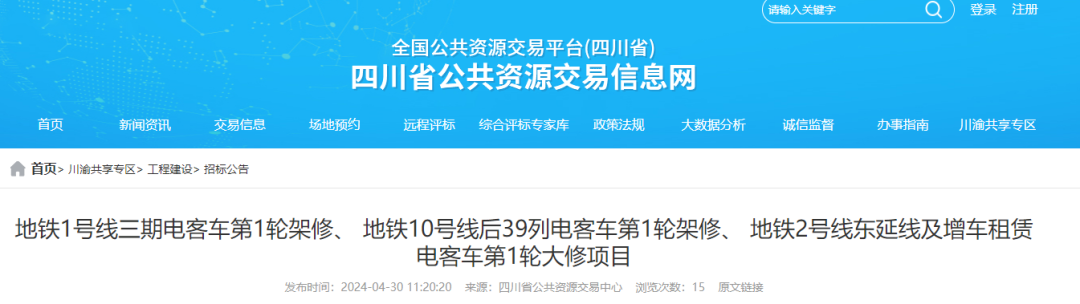 | 2.1 本项目实施地点:成都市 2.2 招标范围:2.2.1地铁1号线三期26列6编组B型电客车(车号:10148-10173)架修,并结合架修同步实施视频监控系统(CCTV)升级改造。2.2.2地铁10号线后39列6编组A型电客车(车号:11007-11045)架修。2.2.3地铁2号线东延线及增车租赁28列6编组B型电客车(车号:10233-10260)大修,并结合大修同步进行28列电客车乘客信息系统(PIDS)升级改造,及结合大修同步进行25列电客车(车号:10233-10235、10237-10246、10248-10257、10259、10260)辅助功能系统照明设备LED灯改造。2.3 项目期限:2.3.1地铁1号线三期电客车第1轮架修期限共计20个月,暂定开始时间为2024年6月1日(含当日),暂定结束时间为2026年1月31日(含当日)。(具体时间以招标人书面通知为准 2.3.2地铁10号线后39列电客车第1轮架修期限共计30个月,暂定开始时间为 2024年11月1日(含当日),暂定结束时间为2027年4月30日(含当日)。(具体时间以招标人书面通知为准) 2.3.3地铁2号线东延线及增车租赁电客车第1轮大修期限暂定37个月,暂定开始时间为2024年9月1日(含当日),暂定结束时间为2027年9月30日(含当日)。(具体时间以招标人书面通知为准) 2.4 标段划分 标段划分:本项目 1 个标段。 | |||||||||||||||||||||||||||||