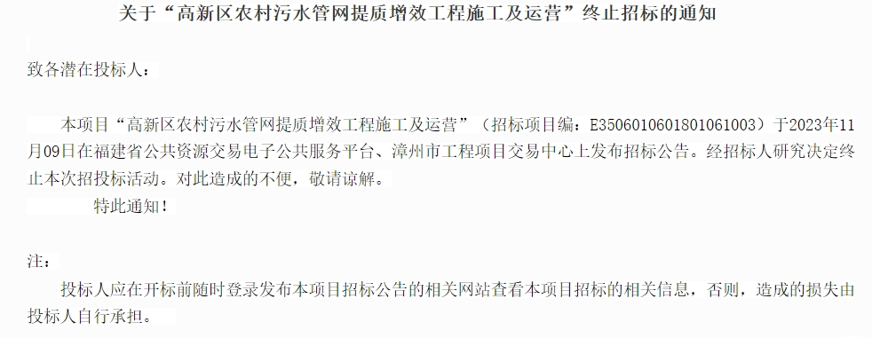 4月29日,福建漳州高新区农村污水管网提质增效工程施工及运营项目发布终止招标公告,公告显示经招标人研究决定终止本次招投标活动。