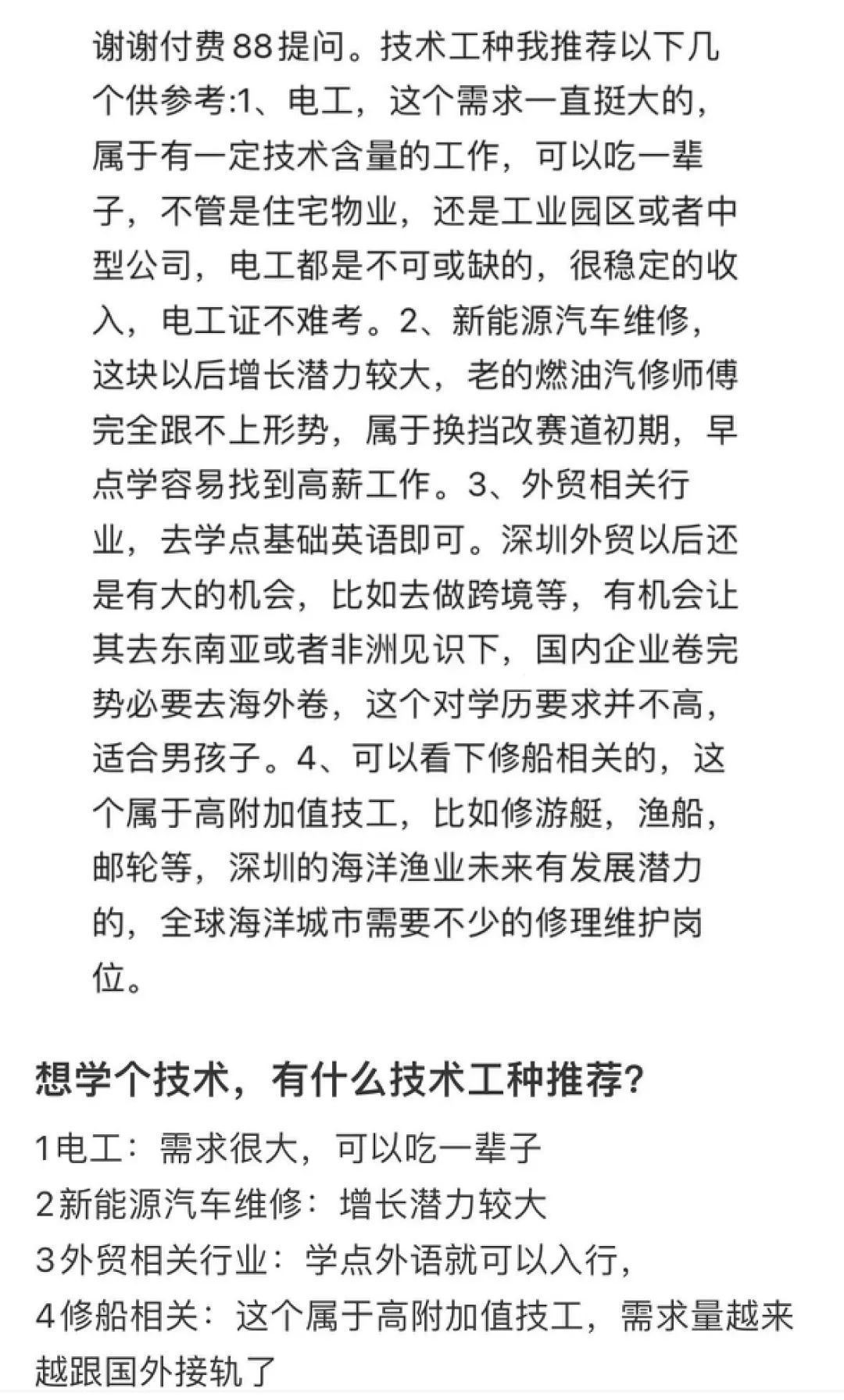 更多情况下,只是在职业学校或者跟着师傅浅学几天技术,还完全达不到可以靠此维生的程度。对此,想要学技术的白领也心知肚明,即使去正经学技术仍不足以应付复杂的实际检修,因为大部分技能需要的是经年累月的实操经验。