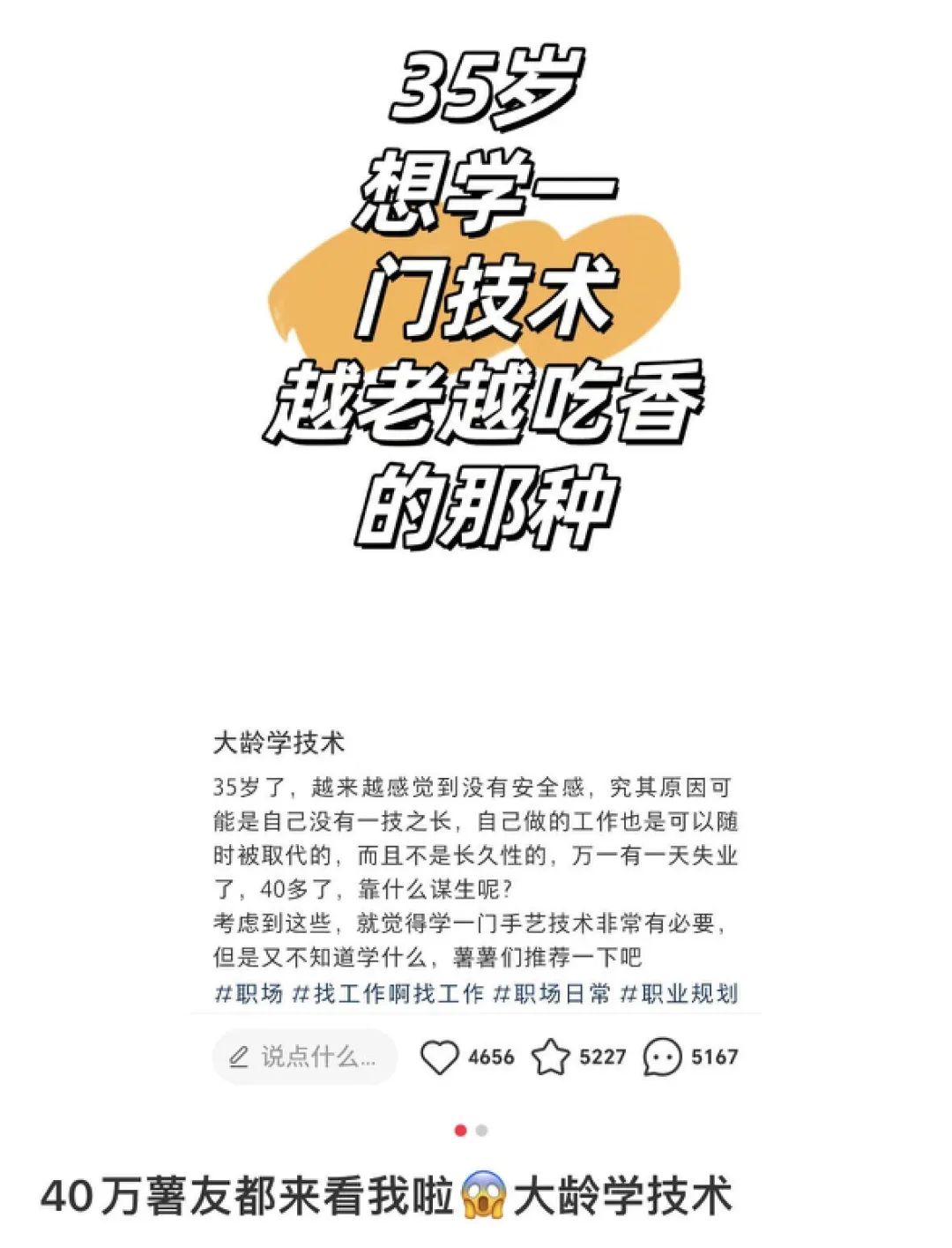 而对于早早站在35岁门槛张望出路的人,学一门实实在在的技术,也成了打工人的职场刚需。“学技术会少很多年龄焦虑,是用资历拼一个未来,姜是越老越辣。”
