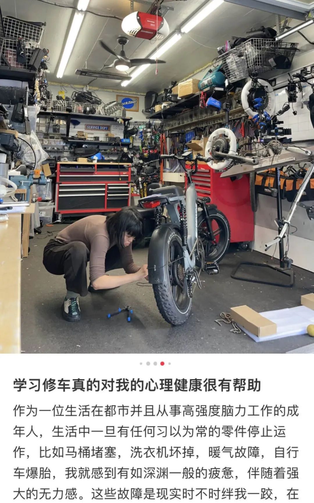 如今,她可以独立维修整个刹车系统,换胎这些小问题更是不在话下,“学习修车真的对我的心理健康很有帮助。”技术带来的快乐,是不需要延迟满足了,当下解决问题,你就能立马获得成就感。