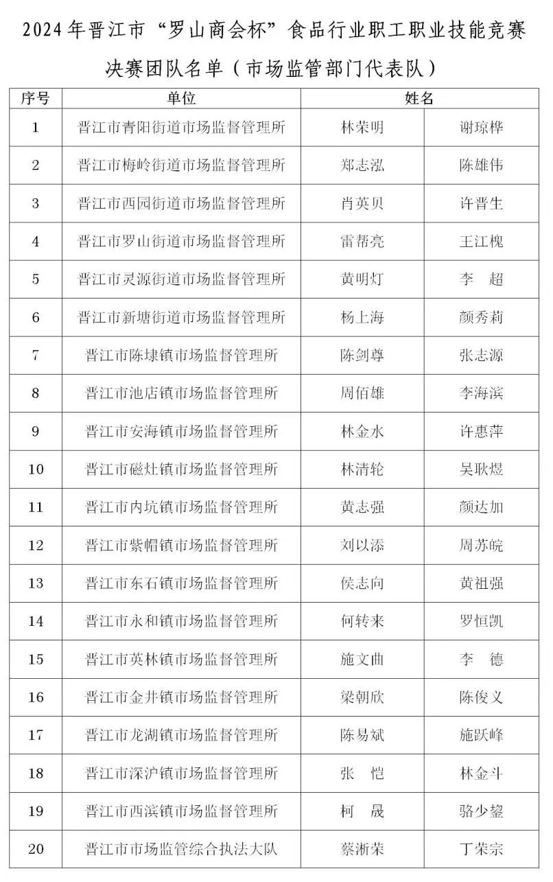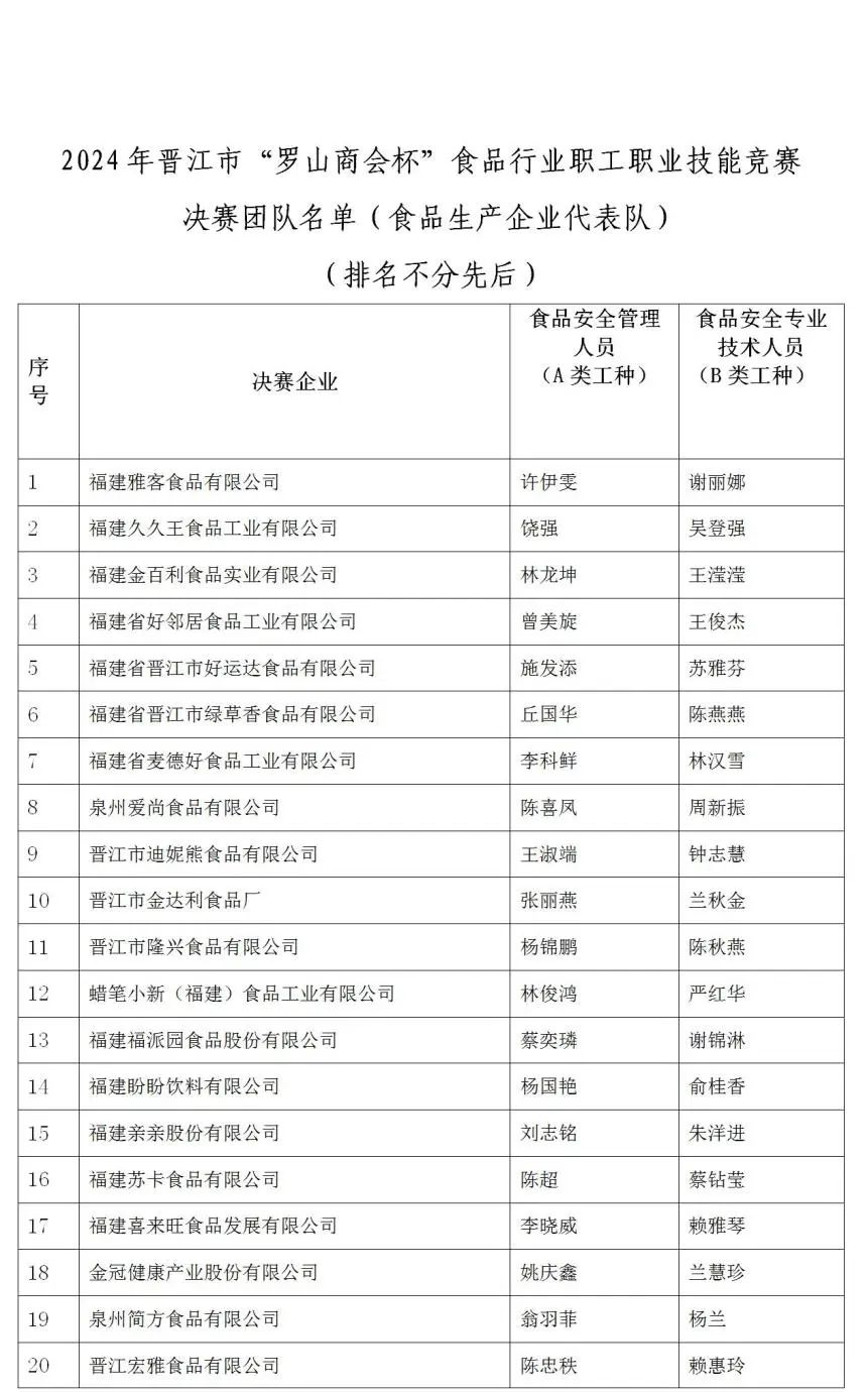 为守牢食品安全底线,促进食品行业技能人才的培养和使用,根据2024年我市职工职业技能竞赛总体安排,经预赛选拔后,共有40支企业参赛队伍、20支执法部门参赛队伍进入决赛。现将2024年晋江市“罗山商会杯”食品行业职工职业技能竞赛决赛团队名单予以公示,如下: