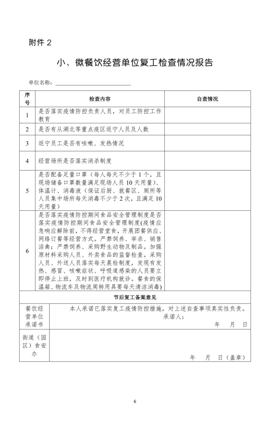 (1)餐饮经营单位完成复工前防疫准备工作,将《个人登记表》(附件1)、《小、微餐饮经营单位春节后复工检查情况报告(防疫)》(附件2)报送至各街道(园区)食安办备案。