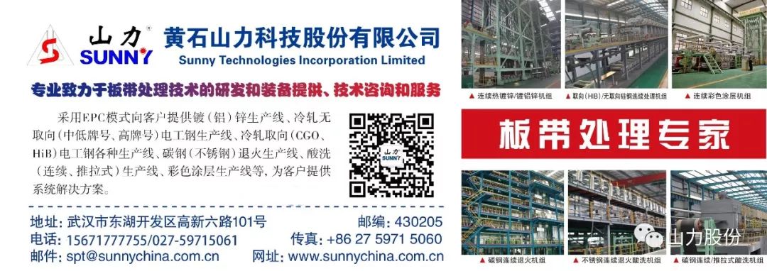 广东中晟4#无取向电工钢连续脱碳退火涂层机组年生产能力为25万吨/年,最大工艺速度为135m/min,可生产产品规格为800-1250mm x 0.35-0.65mm的中低牌号无取向电工钢产品。