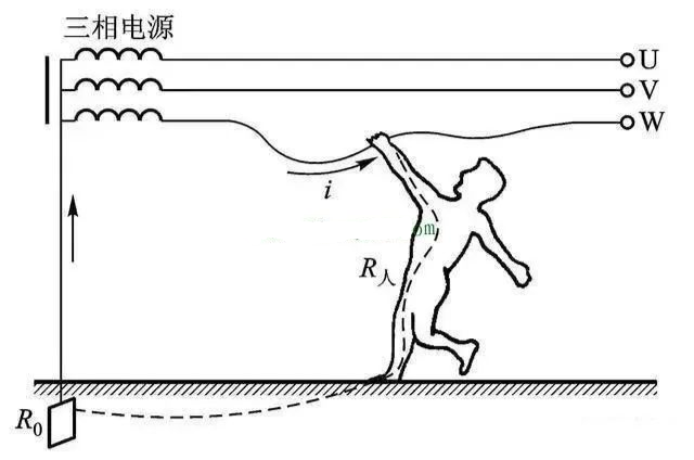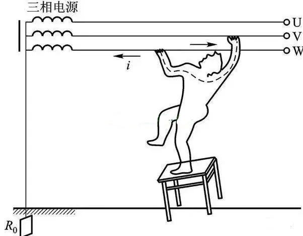 这种情况发生在人体触碰到两根相线,这样导致加在人体之间的电压达到380V,人体与两根相线形成回路,电流流过人体导致触电。