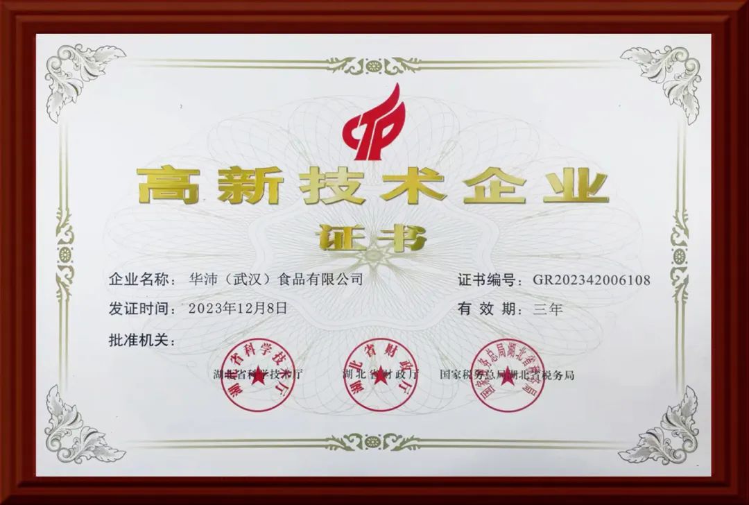 今年初,全国高新技术企业认定管理工作领导小组办公室发布了对湖北省认定机构2023年认定报备的第五批高新技术企业进行备案的公告,华沛(武汉)食品有限公司凭借在农业行业领域的技术创新与突出成果,顺利通过国家“高新技术企业”资格认定并于近日取得了《高新技术企业证书》。