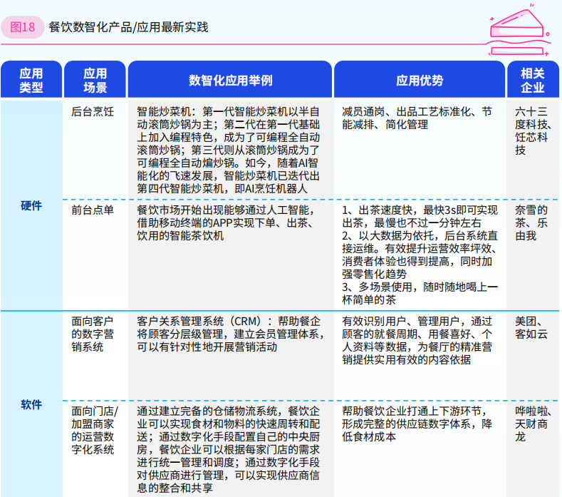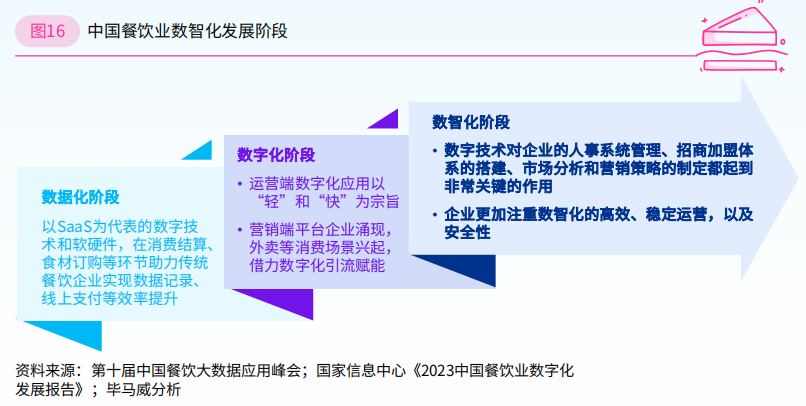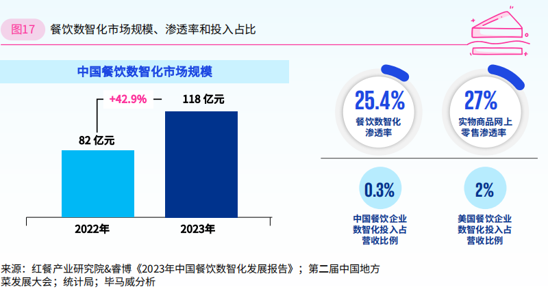 在新一代信息技术深度应用的背景下,国家也在大力推动数字化与实体经济的深度融合。这种趋势正促使各行各业借助数字化和智能化创新,驱动生产力的变革并实现转型升级。在餐饮行业,一些巨头企业正引领潮流,通过巧妙地将技术基础、智慧中台和业务应用结合在一起,不断探索数字化在营销、产品研发、规模化扩张等环节的应用场景和平台价值。这种努力不仅提升了企业的产品实力、组织能力,还增强了其对市场的敏锐洞察力,从而为企业的长期发展提供了强大的赋能。随着数字技术从概念到应用工具再到生态系统纵深管理的演变,中国餐饮行业的数智化变革与转型正在不断加速和迭代,并呈现从记录经营数据的“数据化阶段”、用数据分析问题的“数字化阶段”向智能化管理与人工智能应用的“数智化阶段”演变的趋势,其主要驱动因素有两个:国务院《扩大内需战略规划纲要(2022-2035年)》提出,要顺应消费升级趋势,提升传统消费,发展智慧餐厅等新零售业态,培育“互联网+社会服务”新模式。由此,全国各地相继推出支持餐饮业数智化建设的支持政策,主要聚焦三个方面:①创新消费场景,构建线上业务渠道;②引导企业走出传统服务业大量依赖劳动力、物力投入的发展困境,增强新技术对于供应链管理、综合服务水平的支撑力;③以品牌化为核心,通过总部经济、平台经济、共享经济、定制经济、夜间经济、直播经济等数智化模式,提升竞争力。一方面,人工智能从1.0时代进入2.0时代,AIGC大模型技术等应用和落地,解锁了供应链管理、门店运营决策、产品开发流程、创意营销和客户支持的数智化升级空间。另一方面,企业在数智化进程中更加注重与自身战略目标和组织能力的匹配,根据业务来设定整个SOP体系、考核体系、指标体系、运营流程,在此基础上,针对性匹配数智化工具和系统,从而充分释放技术效能。在从数字化向数智化转型阶段,更多餐饮企业认可数智化工具在营运效率、会员价值和品牌规模这三大核心增长点的引擎作用。同时数智化需求正从前端外卖、小程序点单等客户服务,向利用数字化系统提高门店综合竞争力以及产业上下游协同延伸,由此带动了餐饮数智化市场规模的迅速增长。根据红餐产业研究院数据显示,2023年中国餐饮行业数智化规模达到117.6亿元,同比增长率达到42.9%。然而,餐饮行业整体数智化渗透率仍相对较低,产业升级改造仍有很多机会挖掘。根据中国烹饪协会《中国餐饮业发展现状及趋势分析》,2022年底餐饮业互联网渗透率达25.4%(通过线上餐饮收入占比衡量),与我国70%以上的互联网普及率、以及27%的实物商品网上零售渗透率相比仍有提高空间。此外,餐饮数智化渗透水平在不同体量餐饮主体间存在结构差异。大型餐饮机构通过组建自研团队或第三方采购及合作,在数字化决策体系建设、前中后台一体化管理、门店店务数字化管理等方面积极投入。而中小型餐饮商户囿于普惠数智化产品有待推广、标准体系有待出台、产业上下游链条数字化协同有待提升等问题,不愿或无力投入。由此,在中国“大市场小企业”的行业格局下,行业整体数智化投入呈现不足。聚焦“数字新基建”这一餐饮数智化的基础,餐饮企业在数智化产品和应用研发中,致力于提高技术支撑保障,通过前瞻性基础研究和源头技术供给,在最新实践中持续推动5G、云计算、边缘计算、大数据、区块链、人工智能、SaaS软件服务平台等技术要素在餐饮行业落地应用,构建可以提供丰富数据源、硬件支持、创新解决方案的数智化生态系统。