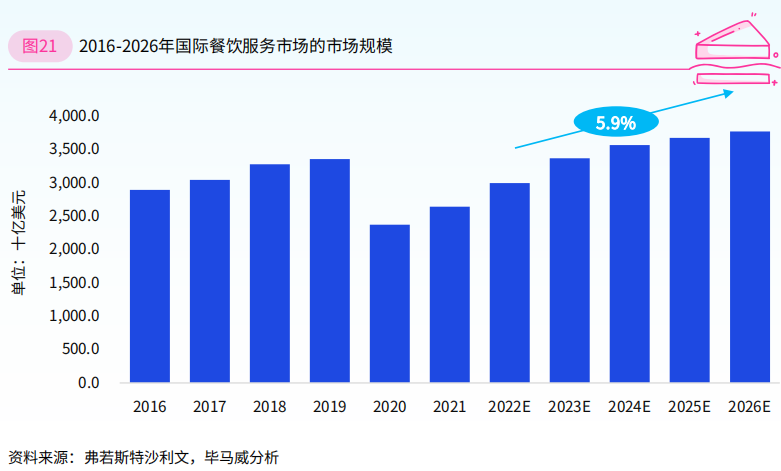 随着越来越多国家陆续恢复交流往来,2023年国际餐饮服务市场将全面恢复到疫情前水平并持续稳定增长,预计至2026年将达到3.8万亿美元,2022年至2026年的复合年增长率为5.9%。