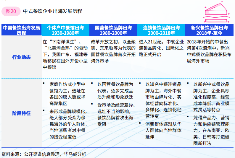 由于卫生条件及饮食文化存在较大差异,这一时期的出海中餐馆尚未形成大规模品牌,本地消费者对中餐的接受程度低,消费受众主要为移民海外的华人群体,当地消费者对中餐的接受程度低。