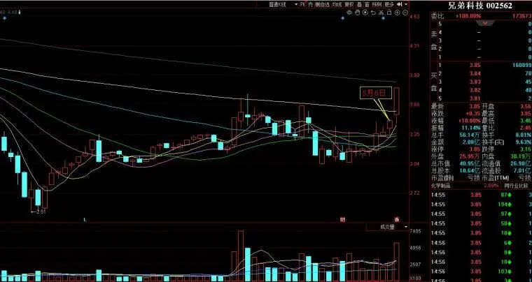 比如兄弟科技,经过充分的调整,近期有回到前高的征兆,并且还小幅带量,这个量能是要大于5.10.20.60日均量线的,5月6日的量能是满足大于5.10.20.60日均量线的,前面的几天也有量能满足的情况,但当时5日线还在下方,没有跟上来,而5月6日这一天的5日线就已经逐步跟了上来,这时可以作为备选标的,次日观察。