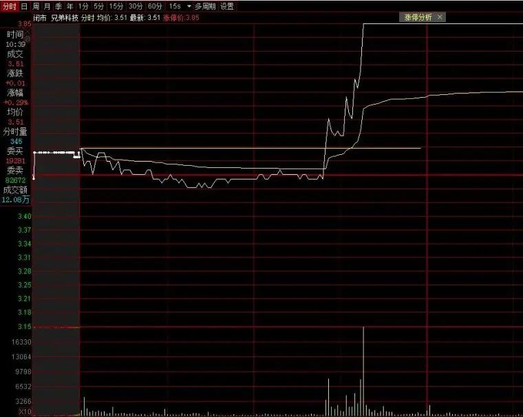 上图是兄弟科技今天的分时,昨天的日线图及量能满足条件,也属于当下热点范围。今天的分时图小幅高开后在均价线之下运行,10点半过后,带量拉升至均价线之上,以及开盘价之上的新高(图中色黄水平线),这一波拉升的高点大致是在4月12日的那个涨停板的价格,也是近段时间的最高收盘价的位置,这是要突破的表现之一,在短暂回踩不破均价线的情况下,是较好的参与点。