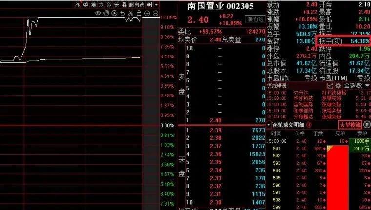 上图是南国置业,今天它的情况也是同样,涨停价的卖单未被吃完,并且今天的实际换手率高达54.36%,属于死亡换手,从以上两点来看,南国置业明天负反馈的概率较大。