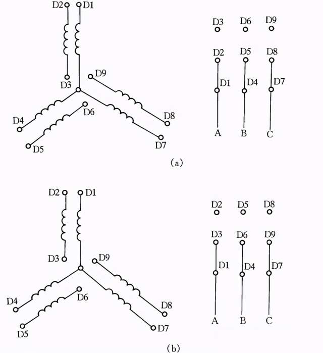 一般常用三相交流电动机接线架上都引出6个接线柱,当电动机铭牌上标为Y形接法时,D6、D4、D5相连接,D1~D3接电源;为△形接法时,D6与D1连接,D4与D2连接,D5与D3连接,然后D1~D3接电源。可参见图1所示连接方法连接。