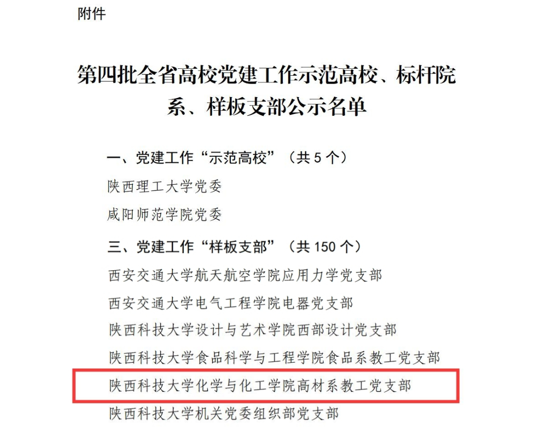 学院党委深入贯彻落实新时代党的建设总要求和新时代党的组织路线,坚持整体创建、系统推进,重点培育、典型引领,全面推进党建“双创”工作,不断增强基层党支部政治功能和组织功能,示范带动基层党支部全面进步全面过硬。其中高材系教工党支部对标建设标准,明确创建目标,创新工作思路,有力推进基层党建标准化规范化建设,通过“党建+”模式持续打造特色育人品牌,以服务国家重大需求和地方经济发展为导向,推动党建工作与教学、科研、育人互融互促,不断提升基层党建工作质量和水平,较好地发挥了示范引领、辐射带动作用。